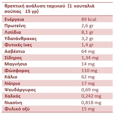 Επιστημονικώς αποδεδειγμένα το σουσάμι, συνεπώς και το ταχίνι, βοηθά στην πρόληψη της υπερχοληστερολαιμίας, στη σωστή λειτουργία του ανοσοποιητικού συστήματος, στην πρόληψη του καταρράκτη και στην αντιμετώπιση του διαβήτη.